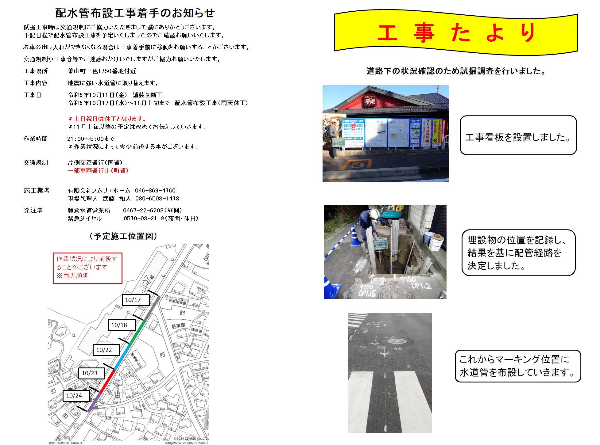 企鎌第16号 新しい管の布設工事が始まります 2024/10/15 皆さんこんにちは。暑さも和らぎ日々秋らしくなってきました。 企鎌第16号の工事もいよいよ本格的に始まります。近隣の方へはすでに配布させていただきましたが 工事予定を皆様にもお伝えいたします。 すべて夜間工事となります。交通規制や騒音などご迷惑をおかけいたしますが、ご理解とご協力を よろしくお願いいたします。