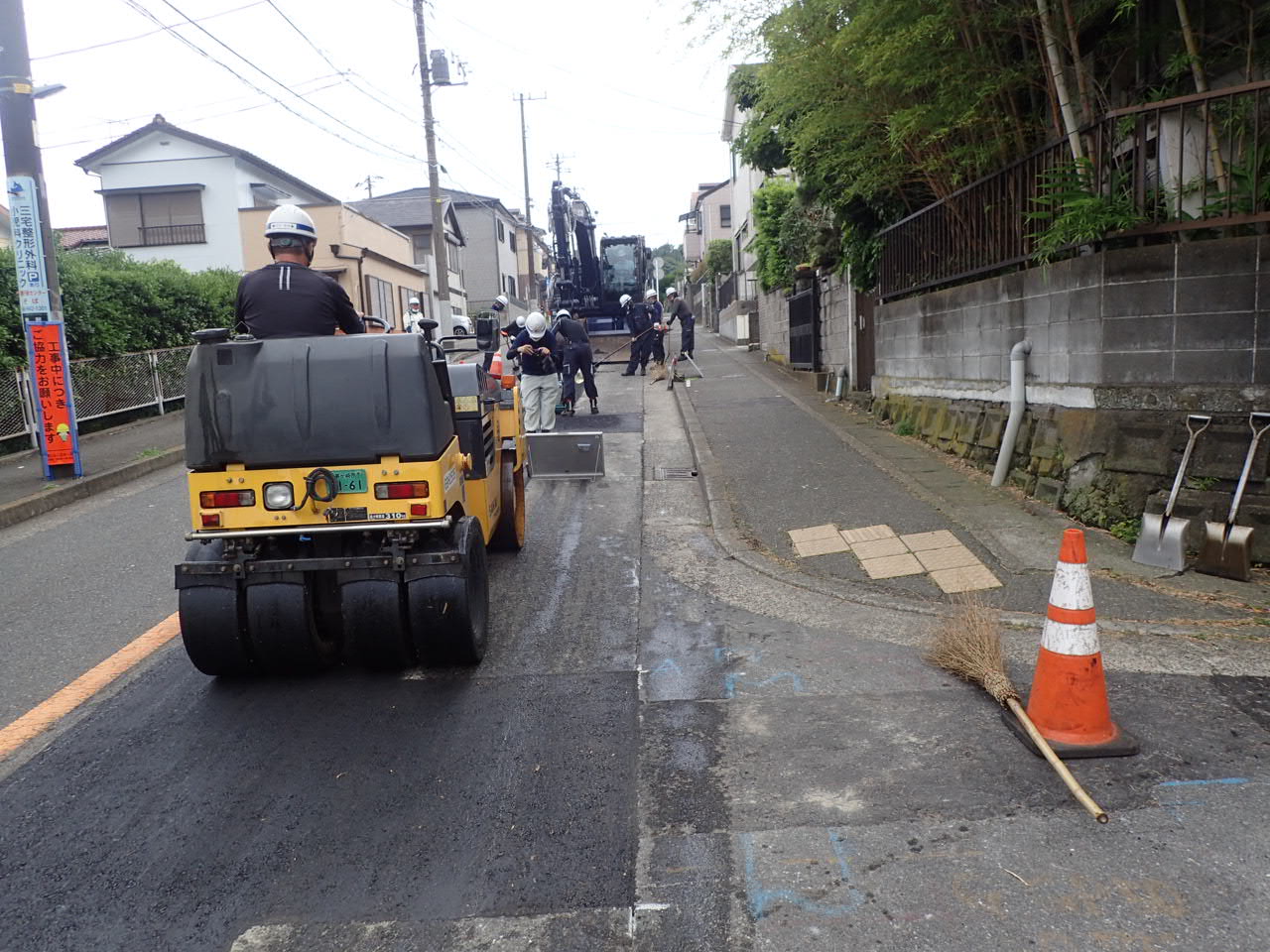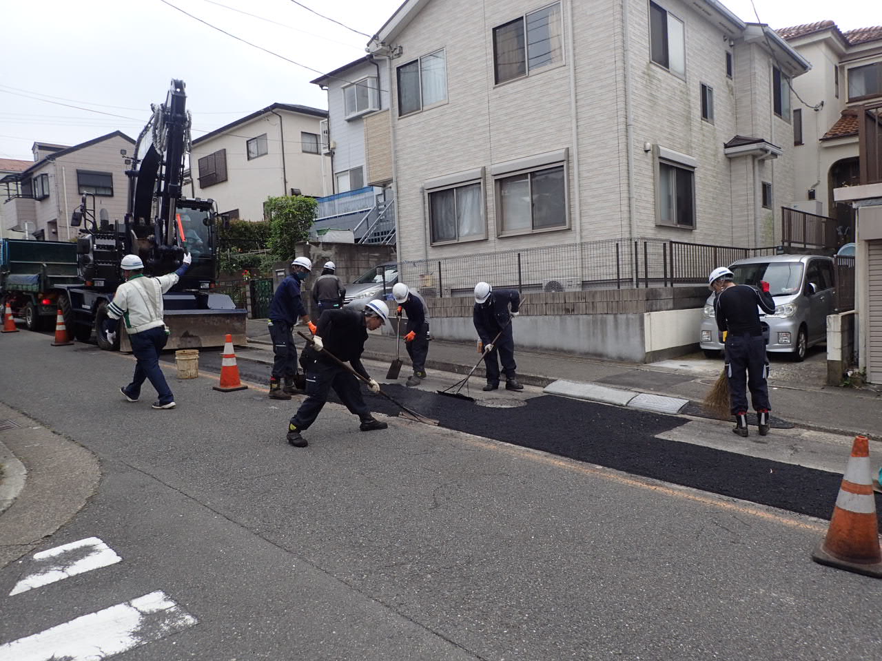 みんなでアスファルトを敷き均しをしている状況です。